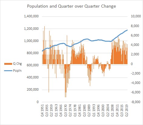 Since 1951, Saskatchewan has experienced 3 major surges in population followed by a plateau and modest declines. The first, from 1951 to 1968, saw the quarterly population advance from 834,000 in 1951 to 962,000 in 1968. This was followed by a drop to 907,000 in 1974. The next population surge was from 1974 to 1987 where it peaked at 1,032,000 in 1987. From 1987 to 1991, the population oscillated between a high of 1,032,000 and a low of 991,000 in 2006. The next surge took place from 2006 to 2019 (so far) fueled largely by international in-migration.
