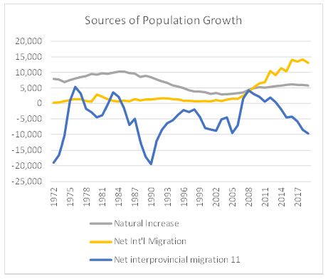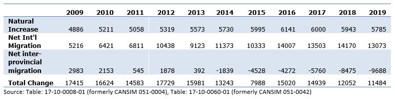 Of concern is the continued drop in net inter-provincial migration (392 in 2013 to -9,688 in 2019). At this level, net inter-provincial migration negates any population gains due to natural increase which is now under 50% of international in-migration.