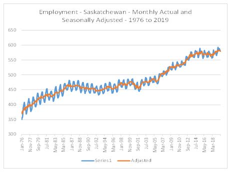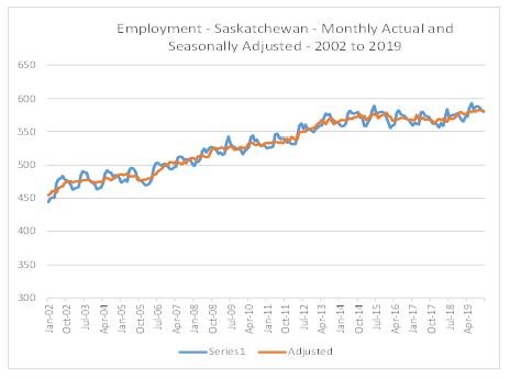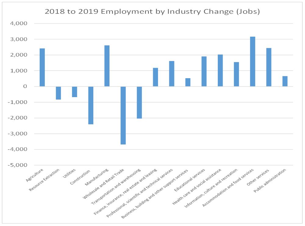 Total employment in Saskatchewan was up 1.8% or 10,400 positions in 2019 over 2018. Year-to-date employment in December 2019 was up over the same period in 2018 in Agriculture (2,408), Manufacturing (2,608), Finance, insurance, real estate and leasing (1,175), Professional, scientific and technical services (1,617), Business, building and other support services (525), Educational services (1,908), Health care and social assistance (2,033), Information, culture and recreation (1,550), Accommodation and food services (3,167), Other services (2,433), and Public administration (658). Year-to-date employment in December 2019 was down in Resource Extraction (-842), Utilities (-683), Construction (-2400), Wholesale and Retail Trade (-3683), and Transportation and warehousing (-2033).