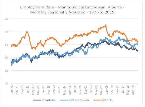 Using the employment rate (number of employed persons expressed as a percentage of the population 15 years of age and over), it is possible to make valid inter-provincial comparisons. Saskatchewan compares favourably to Manitoba, with Saskatchewan falling behind from 1998 to 2006, but pulling ahead from 2007 to 2019. Saskatchewan has not performed well relative to Alberta. However, the gap has narrowed since the oil price crash of 2014.