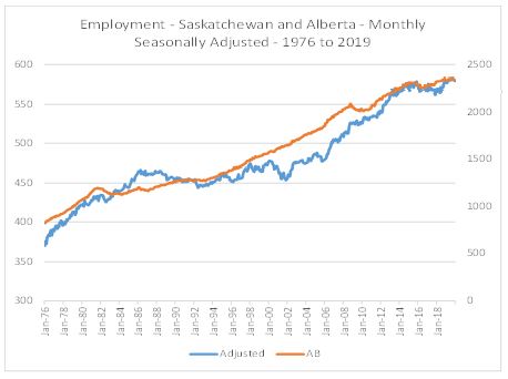 The graph below of total provincial employment allows for two important observations. First, one can see how the seasonally adjusted series is smoother than the actual/raw series and runs roughly at the midpoint of the raw series. Second, it is clear that the province experienced twoclear sustained periods of employment growth. The first ran from 1976 to 1986. This was followed by a plateau where employment ranged from 482,000 (July 1986) to 487,000 (July 2000) and 453,000 (November 2001). This was followed by the second period of sustained expansion to 589,000 in June 2015.