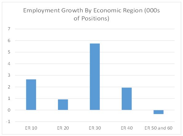 Within Economic Regions (ERs), employment growth was not evenly distributed and concentrated in ERs with large urban centres. ER 30 (Saskatoon-Biggar) saw the largest increase, followed by ER 10 (Regina-Moose Mountain). ER 50 and 60 (Prince Albert and North) saw a modest decline.