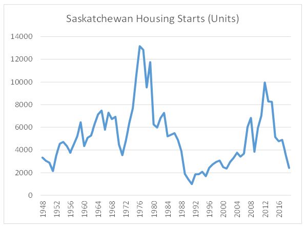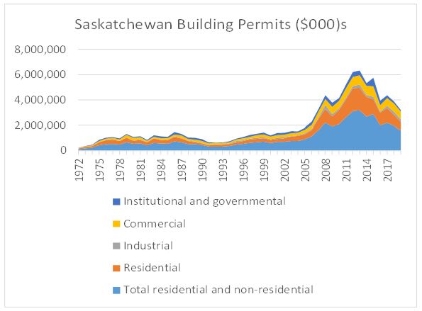 Construction activity in Saskatchewan in 2019 was mostly negative. New housing starts are a good indicator of a region’s economic health. New housing has powerful multiplier effect through the economy and is typically used to derive estimates for other consumer-based indicators. People buying new homes also spend money on other consumer goods such as furniture, lawn and garden supplies, and home appliances.
