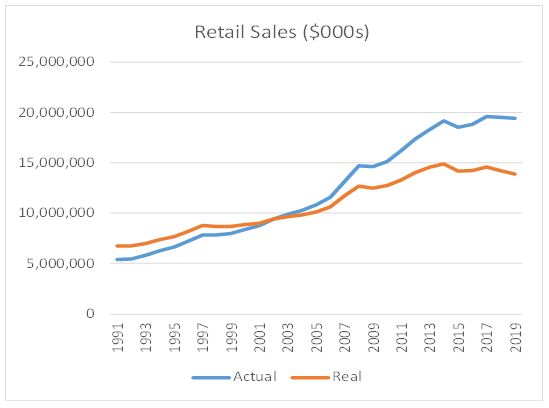 When adjusting retail sales for inflation (deflating retail sales by all-items CPI), the drop is more severe. 2019 real retail trade dropped by 2.2% from 2018 and has exhibited very little growth since 2014.