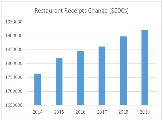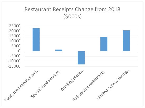 Restaurant receipts data tends to reflect how consumers are feeling about the future of the economy, their job situation, and the overall steadiness of the restaurant industry. 2019 restaurant receipts were up 1.2% over 2018, less than the rate of inflation. Within restaurant receipts Special food services (1.7%), Full-service restaurants (1.8%), and Limited-service eating places (2.1%) increased. At the same time, declines were noted in Drinking places (alcoholic beverages) (-13.3%).