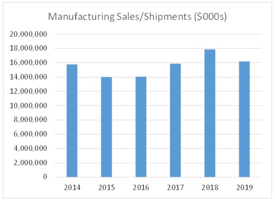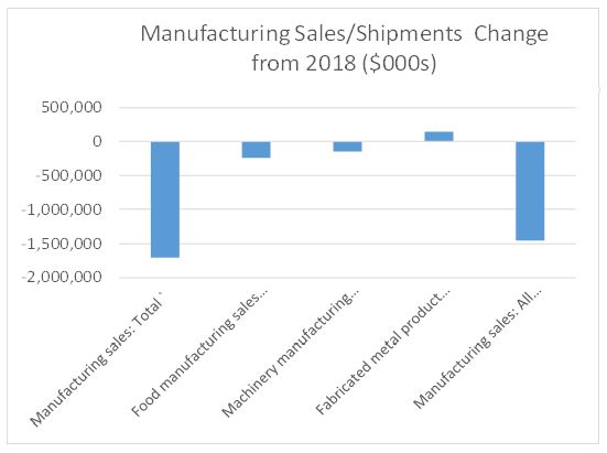 In Saskatchewan 2019, manufacturing sales were down by -9.5% over 2018. Sub sectors that posted increases were limited to fabricated metal product manufacturing sales (18.4%). Sub sectors that posted decreases were Food manufacturing sales (-5.0%), Machinery manufacturing sales (-11.5%), and All other Manufacturing sales (-13.4%).
