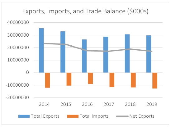 Exports are the goods and services produced in one country and purchased by residents of another country. Besides being a source of foreign exchange, exports are a good indicator of competitiveness. Exports and imports combined make up a country's trade balance. When the country exports more than it imports, it has a trade surplus. When it imports more than it exports, it has a trade deficit. Saskatchewan typically runs a trade surplus in international goods.