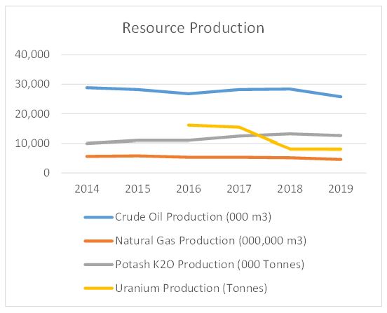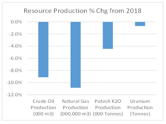 Reflecting soft demand, all major components of resource production declined in 2019 over 2018: Crude Oil Production -9.1%, Natural Gas Production-10.8%, Potash K2O Production -4.4%, and Uranium Production -0.7%.