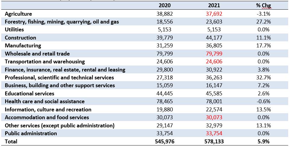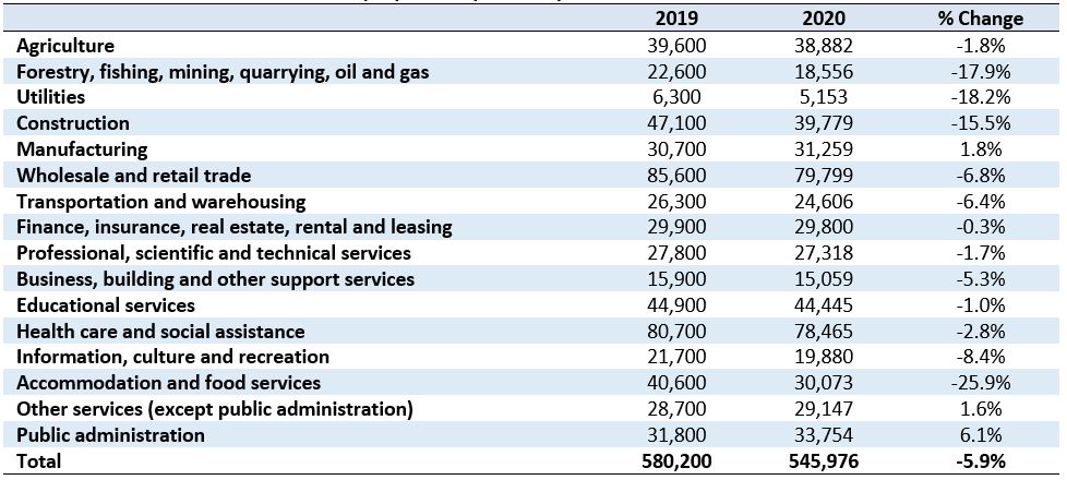 2020 employment by industry is estimated using the 2020 Q2 cumulative change in Provincial employment by industry applied to the remainder of the year resulting in a 5.9% decline in annual employment by the end of 2020.