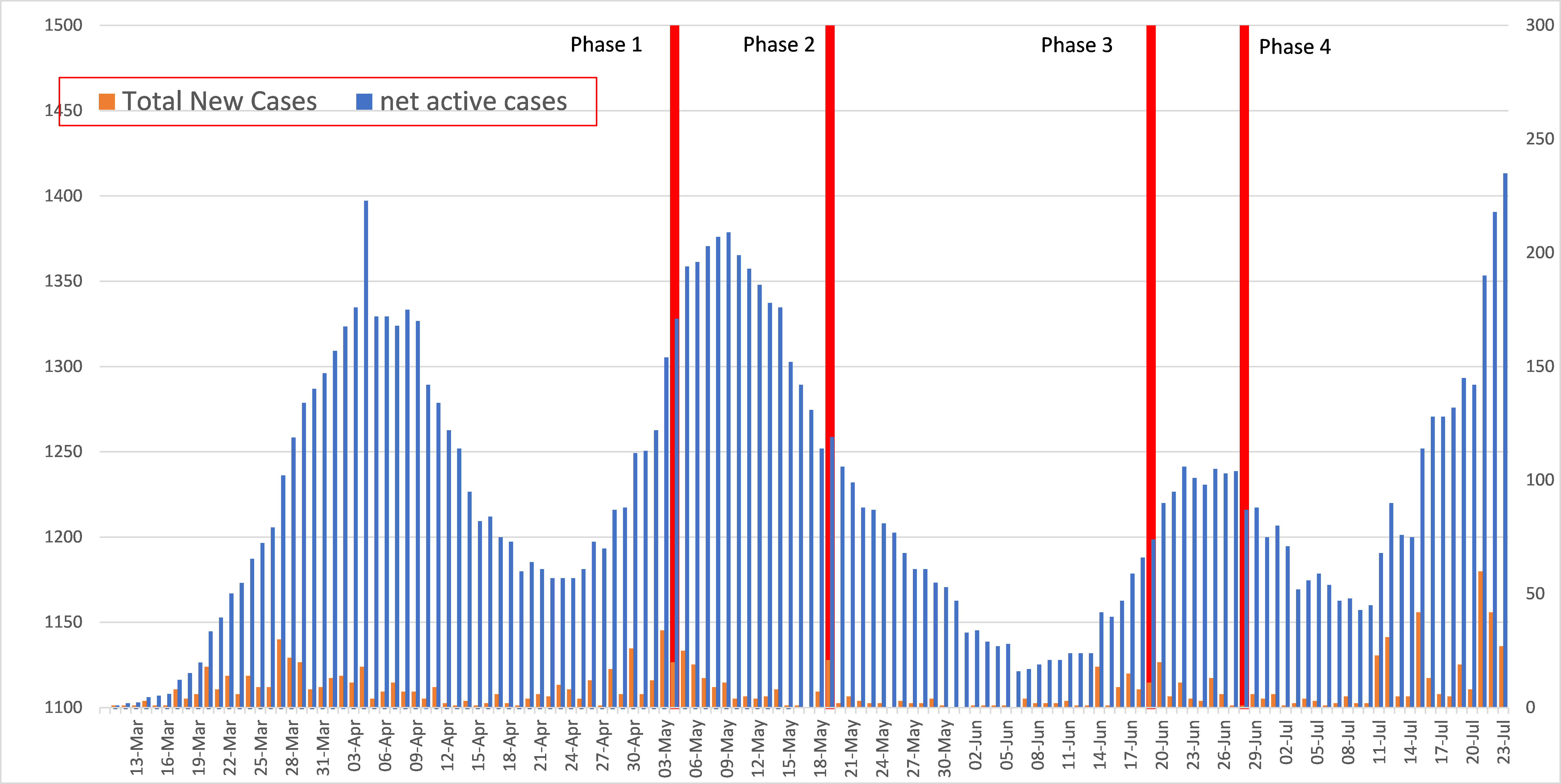Data below shows Saskatchewan new cases and net active cases in relation to Re-Open Saskatchewan Phases 1 through 4.