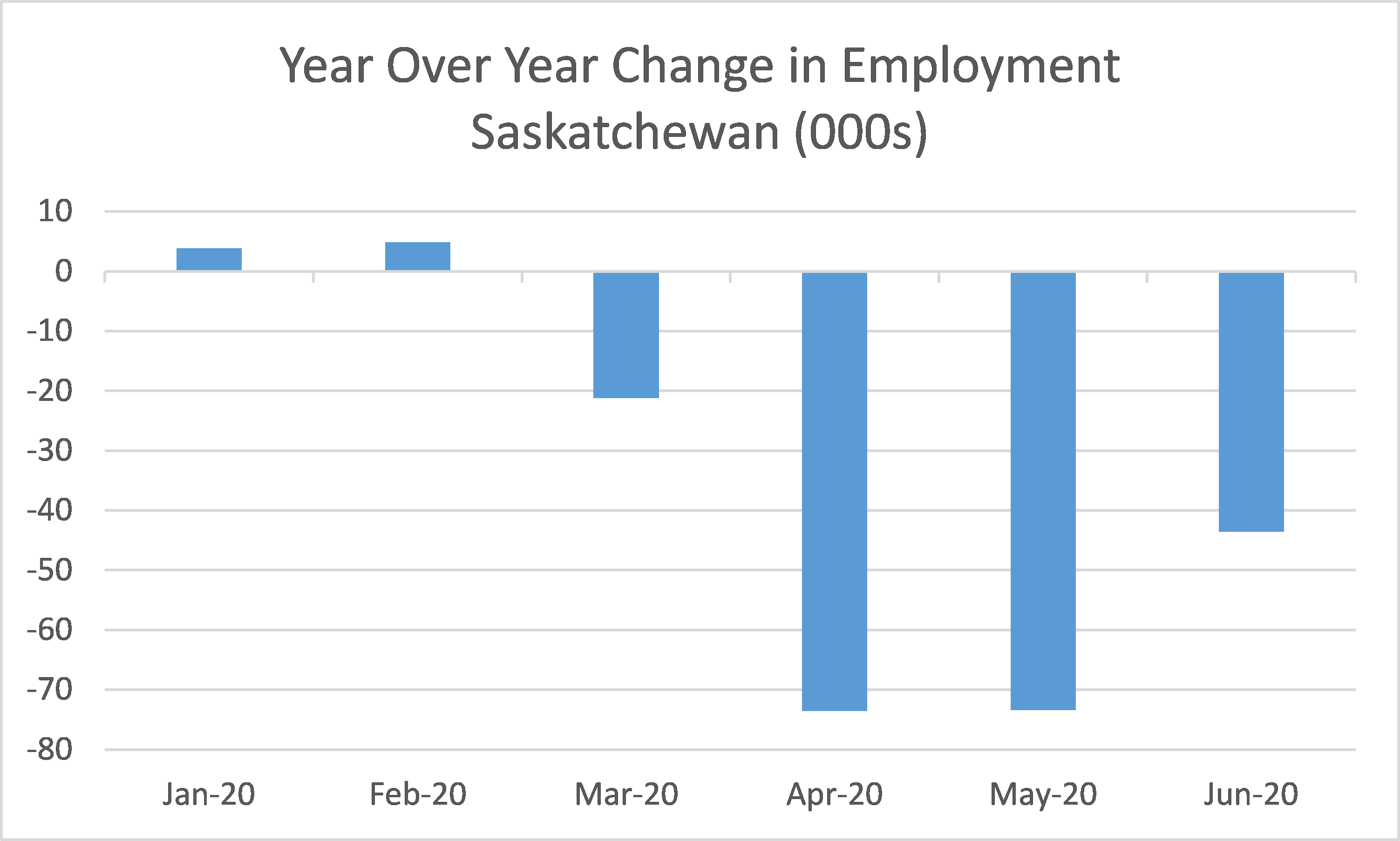 On a year over year basis (comparing to the same month 1 year ago), employment had been in decline since March 2020. In June 2020, the year over year decline was 22,400 positions with average year to date employment being down by 33,833 or -5.9% over the same period in 2019. As such, Saskatchewan is not yet in a technical recession.